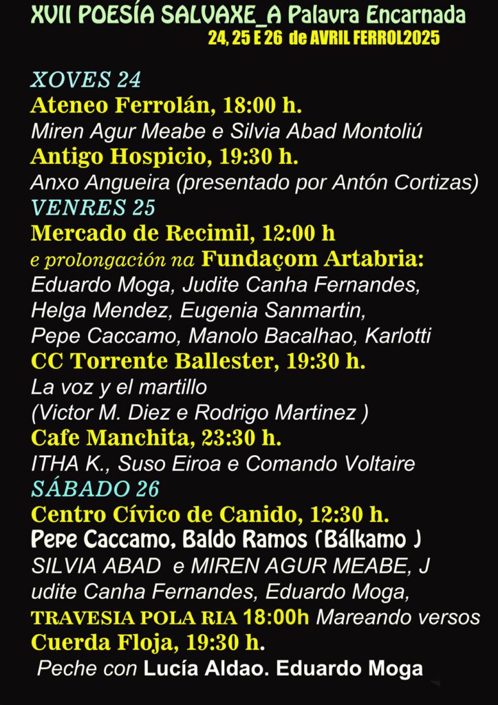 Os Días 24, 25, 26 de Avril do ano 2025, como na primeira volta, a poesía, a palabra encarnada tomara as rúas da CIDADE DOBRADA, e desdobrará as súas esquinas, recunchos e prazas, facendo das poetas e poetas, arte sanos da resistencia e da risa, do agarimo de rir, da tradución do silencio do Mundo